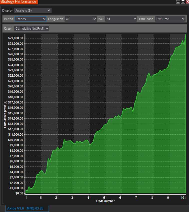 With AXIOS, nearly all orders are executed using LIMIT orders. This design ensures unmatched backtesting accuracy and cleaner fills compared to strategies relying heavily on market orders.